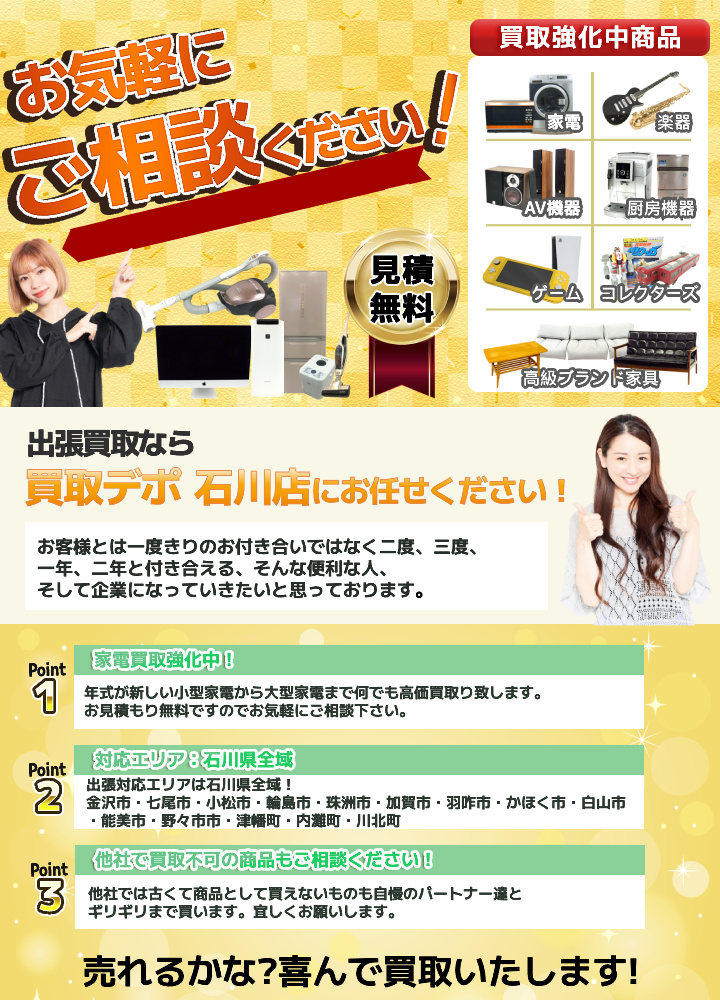 石川県の出張買取のお店一覧。買取に来てくれるお店の一覧です。不用品買取のお店探しならポータルサイト「ウルタス」。高く売りたい、信頼できるお店を探したいならウルタスへ。豊富なクチコミから信頼できるお店を探せます!